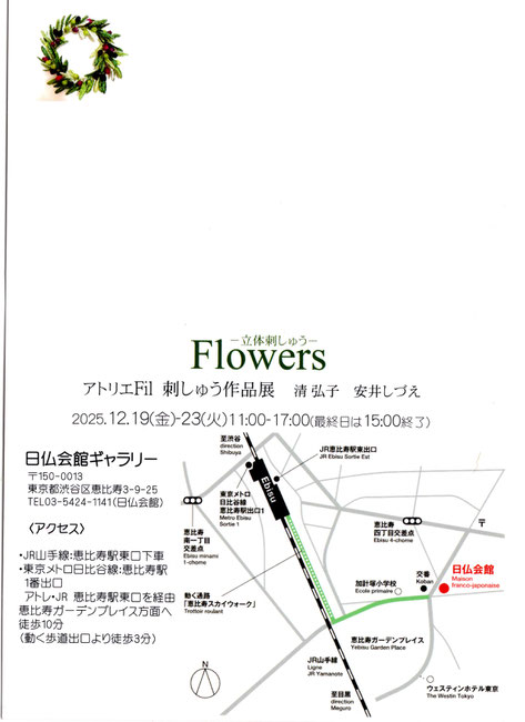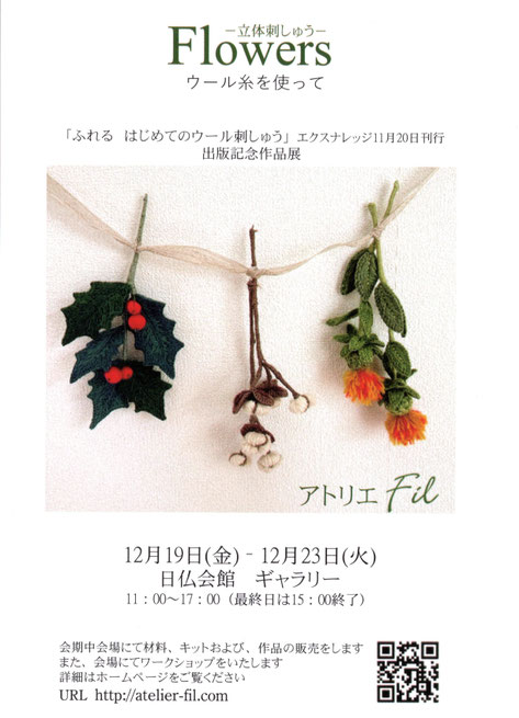西武渋谷店 7F サンイデーで「ぷっくりかわいい立体刺しゅう」(ブティック社)「立体刺繍で織りなす、美しい花々とアクセサリー」(日本文芸社)2冊の本とその中の作品を何点か展示していただきます。